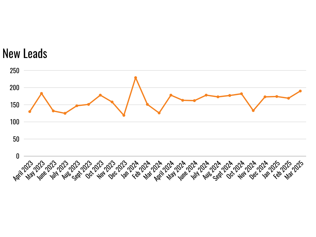 While website traffic tells part of the story, new leads are where strategy turns into action. When we look back at early 2023, they were averaging 125 new leads per month. Fast forward to today, and they’re averaging over 160/month, with 3,893 total new leads across two years.